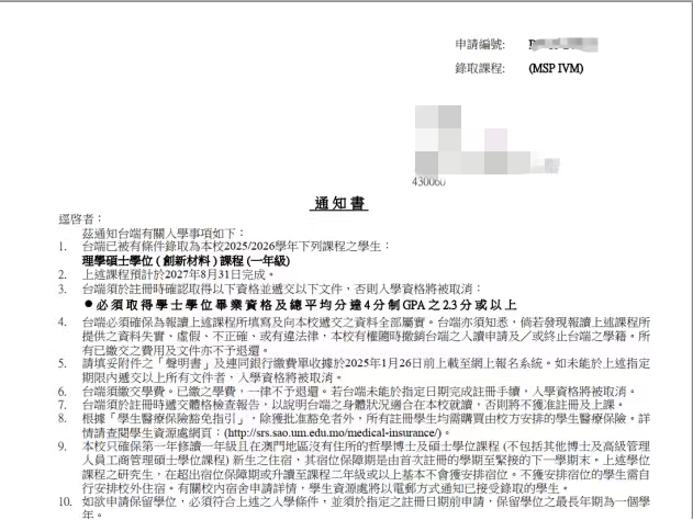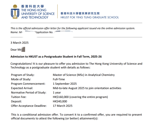 录取专业 : 港科:Master of Science (MSc) in Analytical Chemistry;澳门大学:创新材料