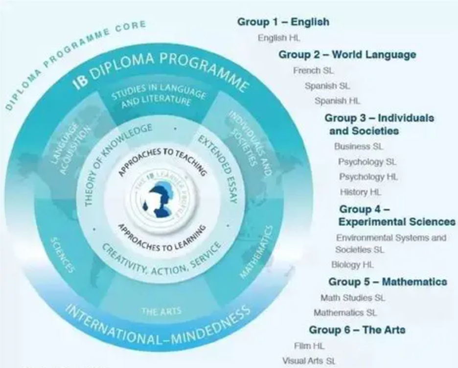 其课程由六大学科组构成(语言文学、语言习得、人文与社会科学、科学、数学、艺术),并辅以拓展论文(EE)、知识理论(TOK)和社会服务(CAS)三大核心项目。