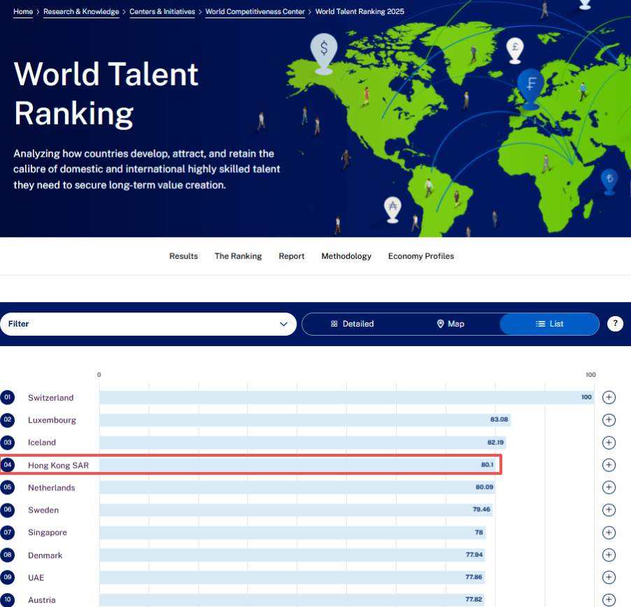 此外,香港在世界人才排名节节上升,两年内上升共12位至世界第四,在亚太地区更位列榜首。