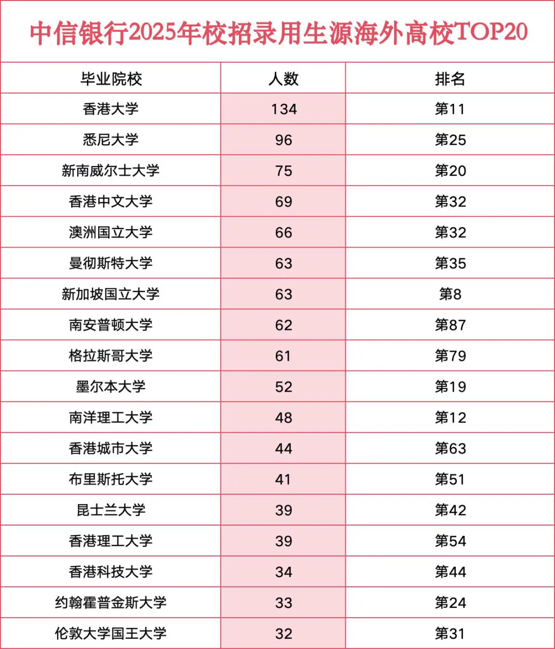 在中信银行公布的2025年校园招聘拟录用名单, 共录取5179人 ,其中 留学生1608人 ,占比达 30.6 % ,留学生占领重要名额。