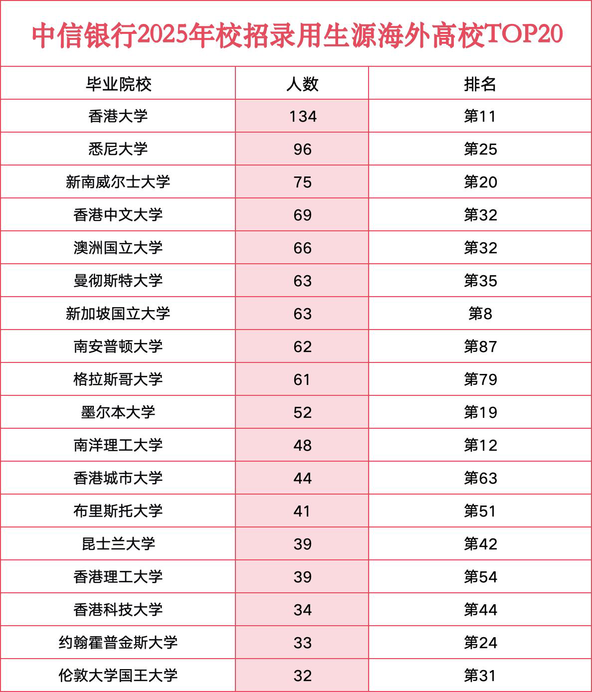 中guo香港高校表 现突出: 香港大学以 134 人 的录用人数位居榜首,香港中文大学、香港城市大学、香港理工大学、香港科技大学也均在榜单前列,可以看出中信银行对中guo香港高校生源的青睐。