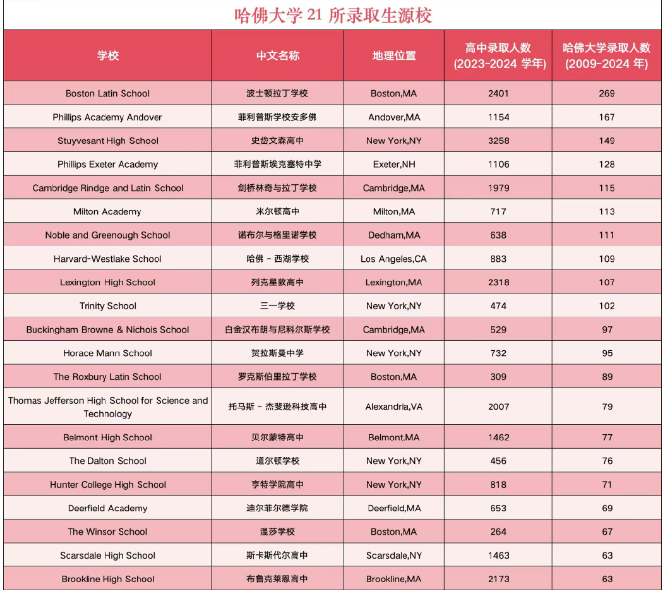 就在前不久,哈佛大学公布 21所录取生源校 !在2009至2024年总共向哈佛输送了 2216名学生 ,由此看来, 想进藤校,先卷美高!!