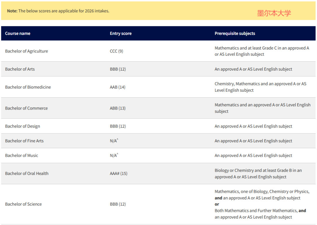澳洲八大A-level直申要求澳洲八大统一采用A-level成绩换算标准(A*=6,A=5,B=4,C=3,D=2,E=1),但不同院校、专业的分数要求略有差异,以下为 2026 年入学的核心要求(供参考):墨尔本大学:本科入学最低要求为AAA-CCC,IB成绩25-35分。热门专业中,生物医学学士需 A-level 包含化学、数学 + 英语;商科需数学+英语;科学学士需数学 + 生物/化学/物理(或双数学)。