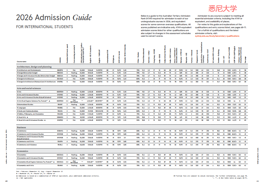 悉尼大学: 以3门或4门A-level成绩核算,3门成绩要求11-17分,4门成绩要求11-21分(IB26-41分)。例如建筑设计类专业通常需15-17分,文科类专业多为11-13分。