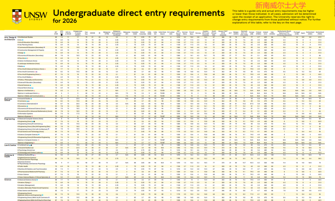 新南威尔士大学: 取3门最优A-level成绩,商科、法律需15分,工程需12分,设计/科学类需10分(IB26-42分),分数门槛在八大中相对亲民,适合目标明确的学生。