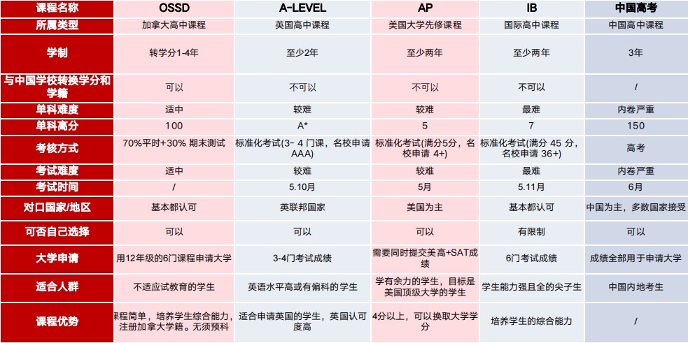 OSSD与A-level、AP、IB、高考课程体系对比: