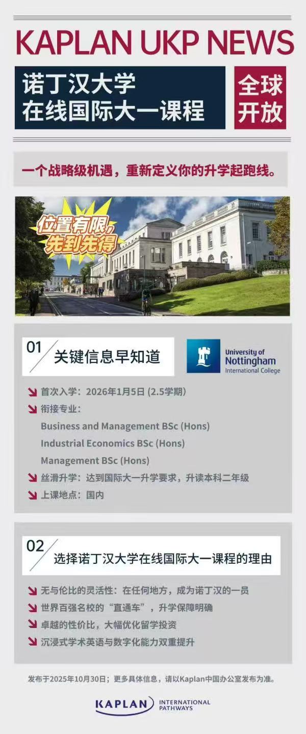 英国诺丁汉大学,QS前百的世界名校,今年开设了在线国际大一,学生可以在国内就读。首次入学时间为2026.1.5日,衔接专业:Business and Management Bsc/Industrial Economics Bsc/ Management Bsc. 达到国际大一升学要求,即可升读本校大二。
