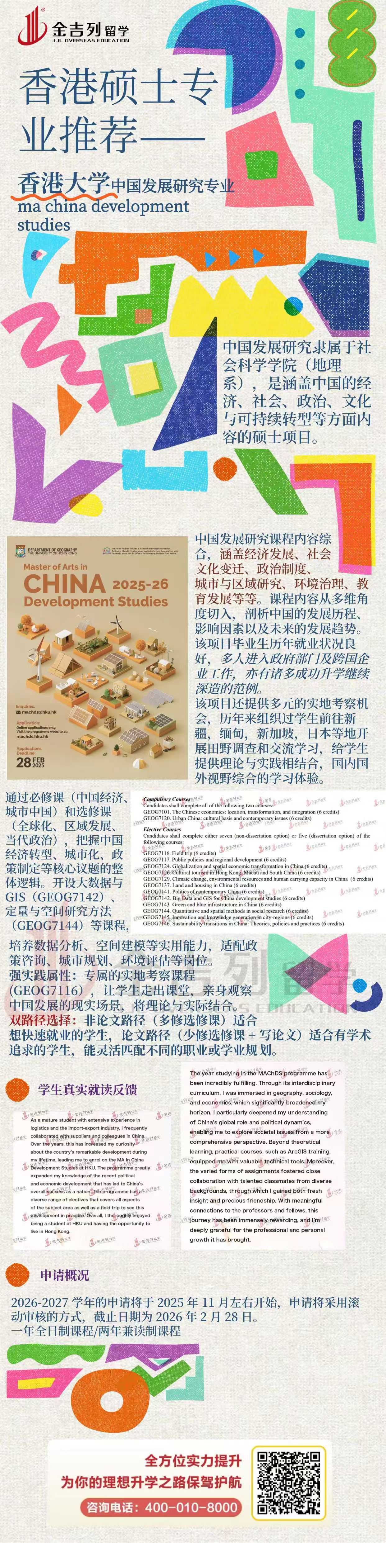 香港大学中国发展研究硕士Ma China development studies, 课程隶属于社会科学学院(地理系),是涵盖中国的经济、社会、政治、文化与可持续转型等方面内容的硕士项目。毕业生历年就业状况良好,多人进入政府部门及跨国企业工作,亦有诸多成功升学继续深造的范例。