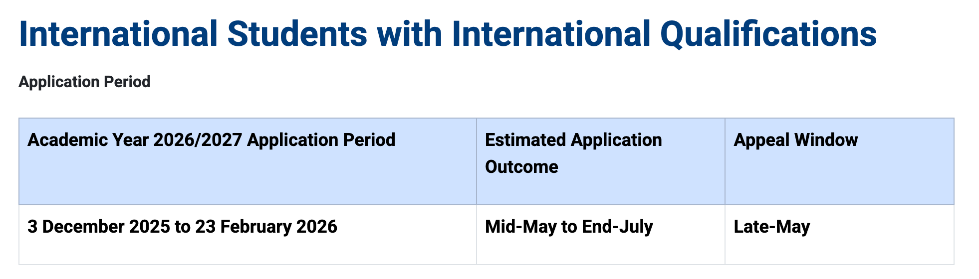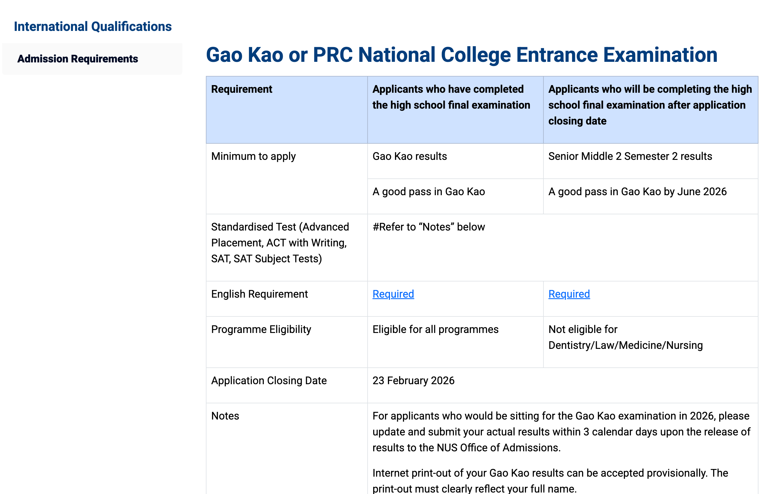 2026年参加高考的应届生:不可申请牙科、法律、医学、护理学专业,需在成绩公布后 3 个自然日内,向 NUS 招生办公室更新并提交实际高考成绩。