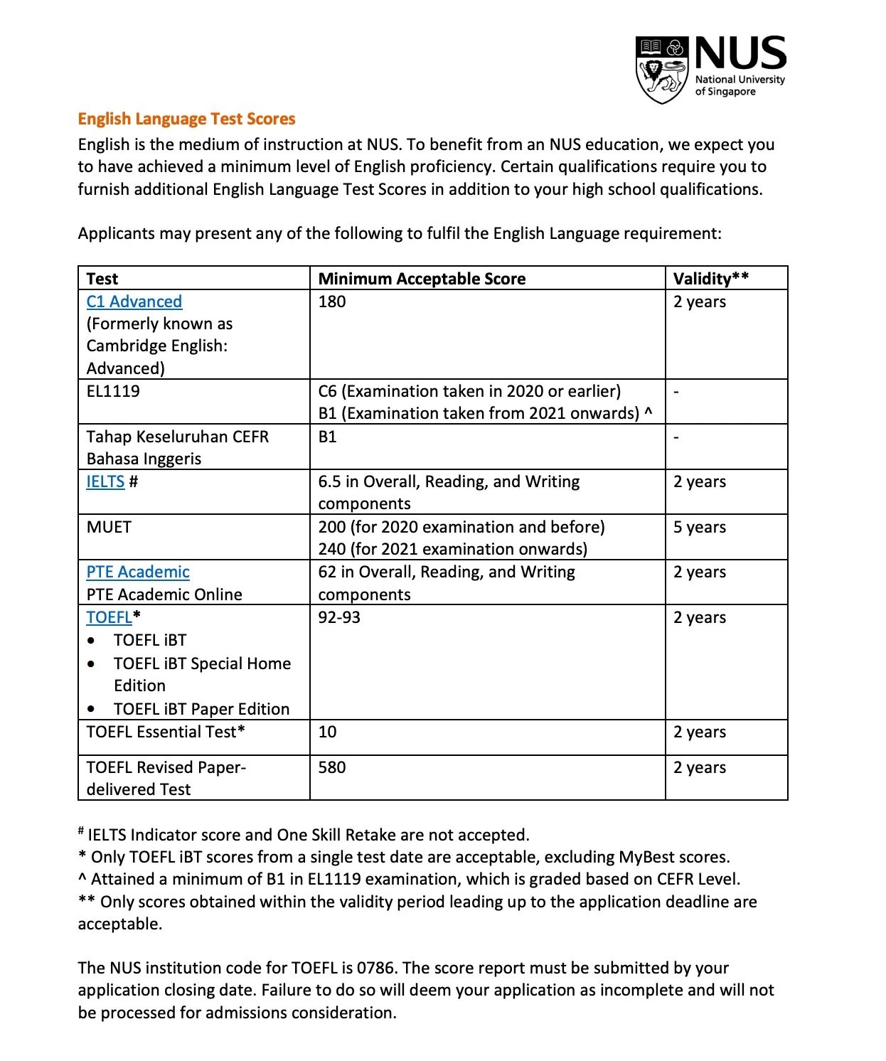 英语是新加坡国立大学(NUS)的教学语言,所以校方要求申请者达到最低的英语 proficiency 水平,可提交以下任意一项英语语言成绩。
