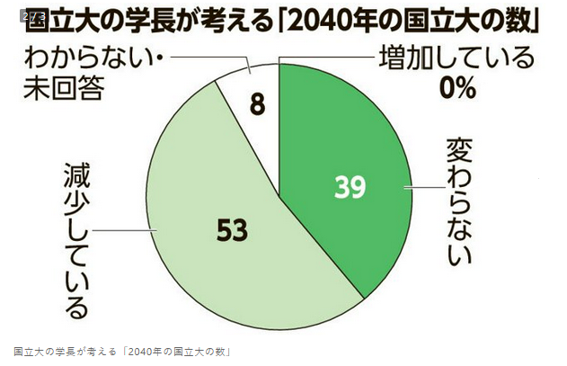 据日本媒体报道称,《朝日新闻》与河合塾联合实施的调查显示,在日本持续低生育率的2040年,有53%的国立大学校长认为“国立大学数量将减少”。