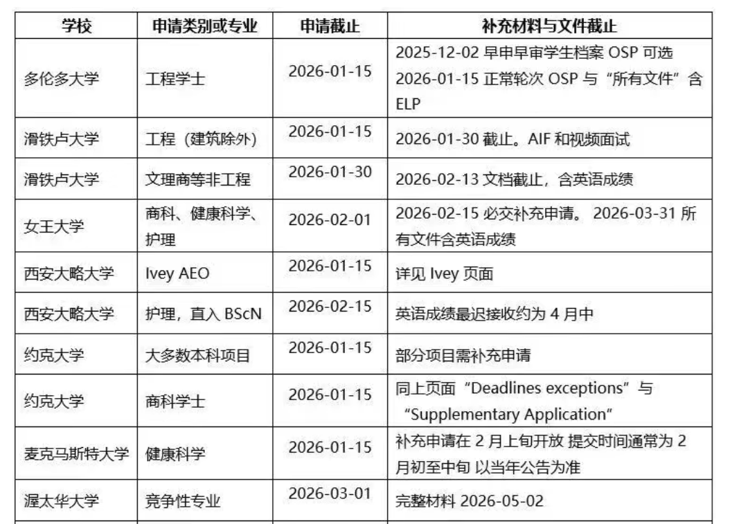 除了OUAC的统一要求之外,每一所学校还有自己的申请截止时间,主要体现在申请文书方面,尤其是竞争比较激烈的专业,如工程、商科、健康科学等。