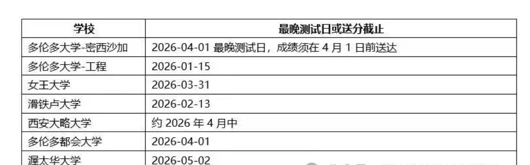 英语语言能力(ELP,含雅思、托福等)是国际学生录取中最关键的非学术条件之一。不同学校对“最晚测试日期”和“送分截止”规定不同,有的以“文件截止”为准,有的以“测试日”计算。以下为部分学校和专业的语言成绩截止时间。