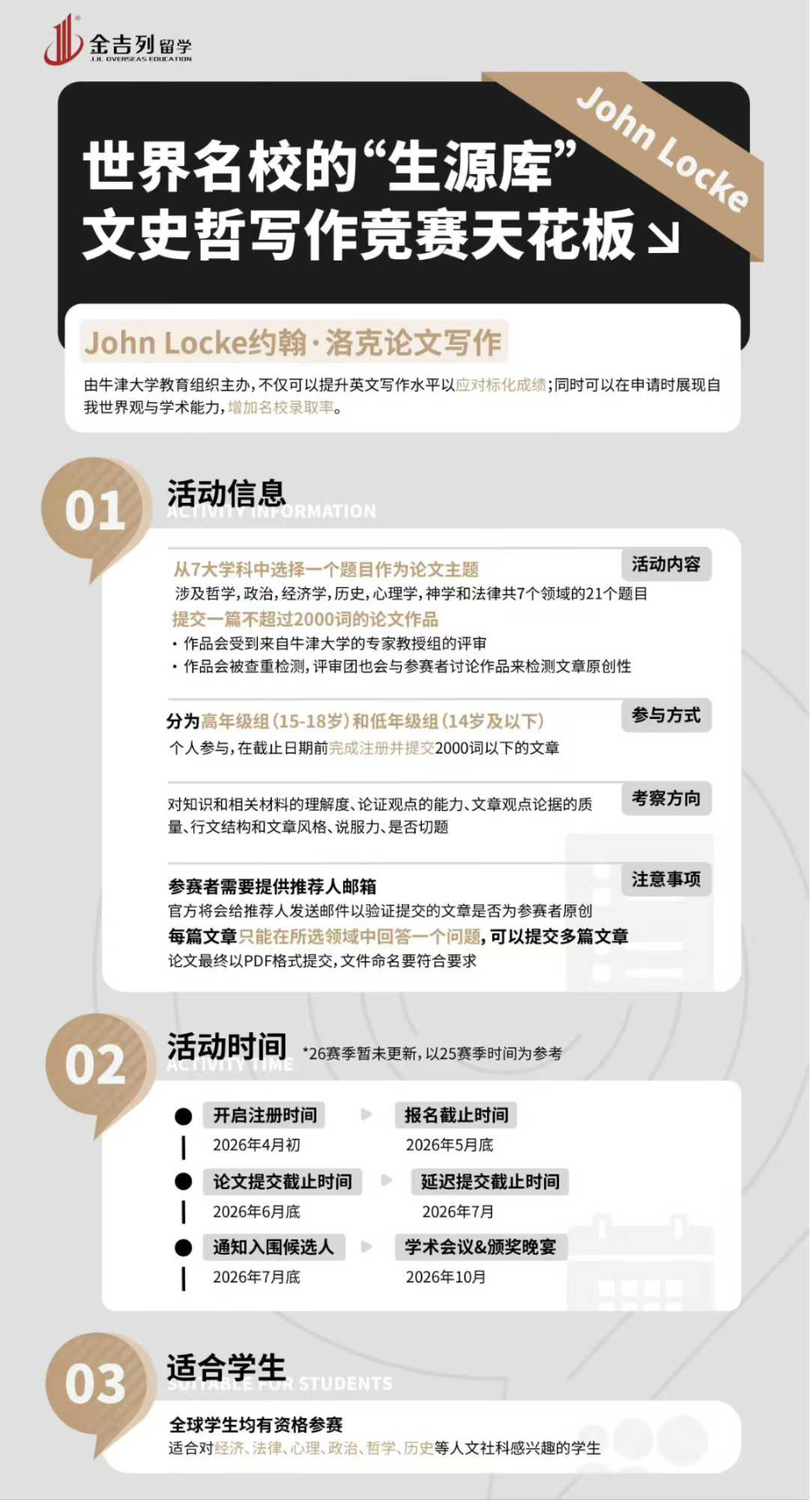 John Locke是英国牛津大学和美国普林斯顿大学等名校教授合作组织的学术项目,往届优胜者遍布哈耶普斯牛剑世界名校。 在比赛中掌握的写作核心技巧能够帮助同学们在申请中向招生官展现优势;名校招生官更青睐全面发展、能够表达自身想法和世界观的学生。