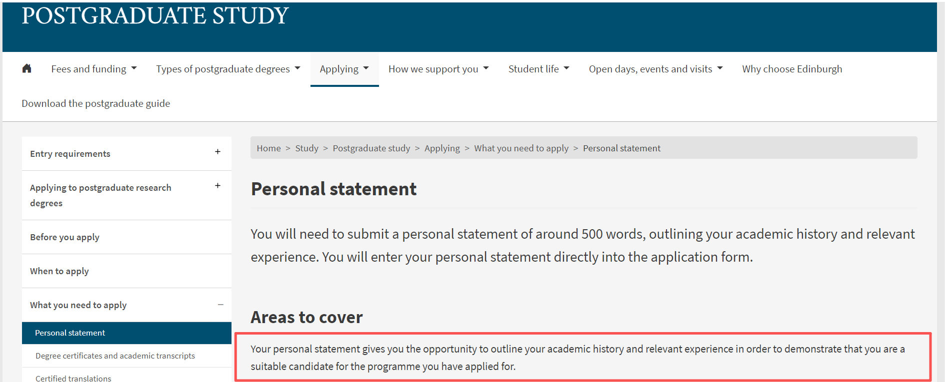 ·爱丁堡大学:爱丁堡大学在其研究生申请页面提到,学校会综合评估申请者的学术成绩、个人陈述、推荐信等,其中,个人陈述的指导中提到“概述您的学术背景和相关经历,从而证明您是所申请项目的合适人选”。这其中科研经历可以作为重要的支撑内容。