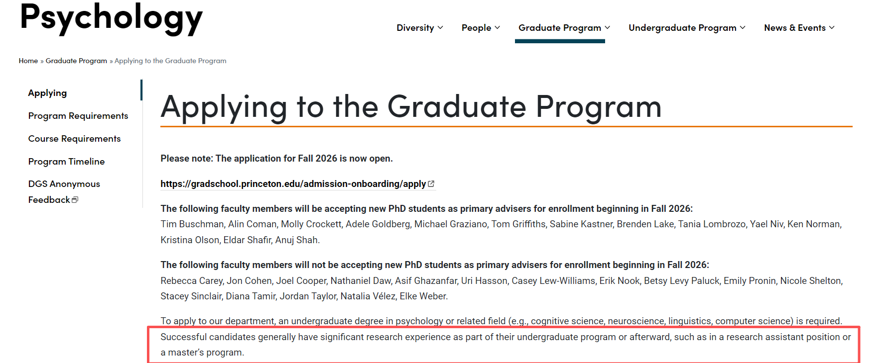 ·普林斯顿大学:26Fall-普林斯顿大学心理学系的研究生项目申请要求中提到:“成功的申请者通常在本科期间或之后有丰富的研究经验,如担任研究助理或参与硕士项目”。