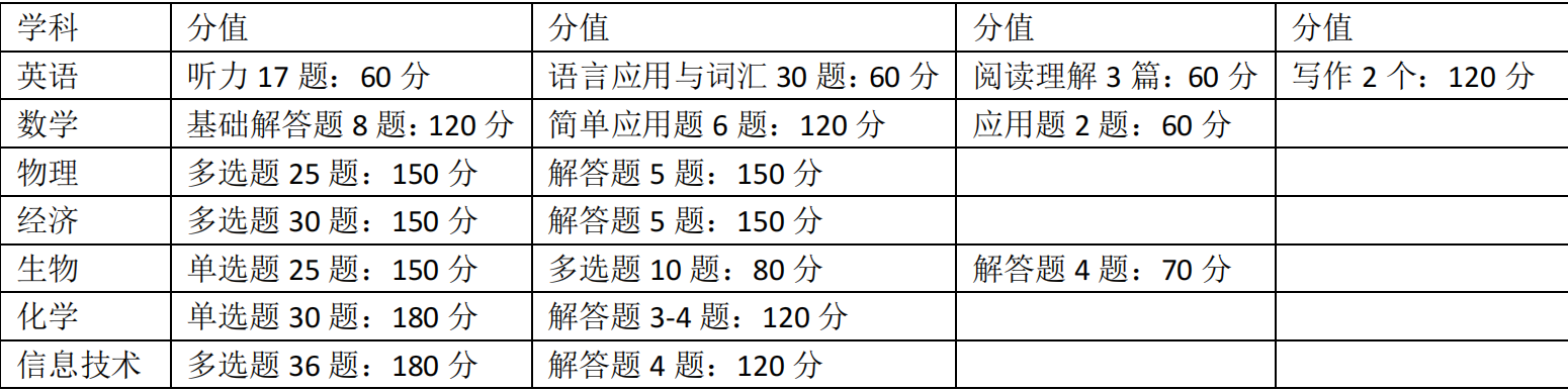 英语:考试时长 2.5 小时,题型涵盖听力、词汇与结构、阅读理解、写作等。其难度高于高考英语,接近大学水平的学术英语,整体要求大概和雅思 6.0 + 水准相当,重点考查学生的综合学术英语运用能力,适配海外院校的听课、论文撰写等学术场景。