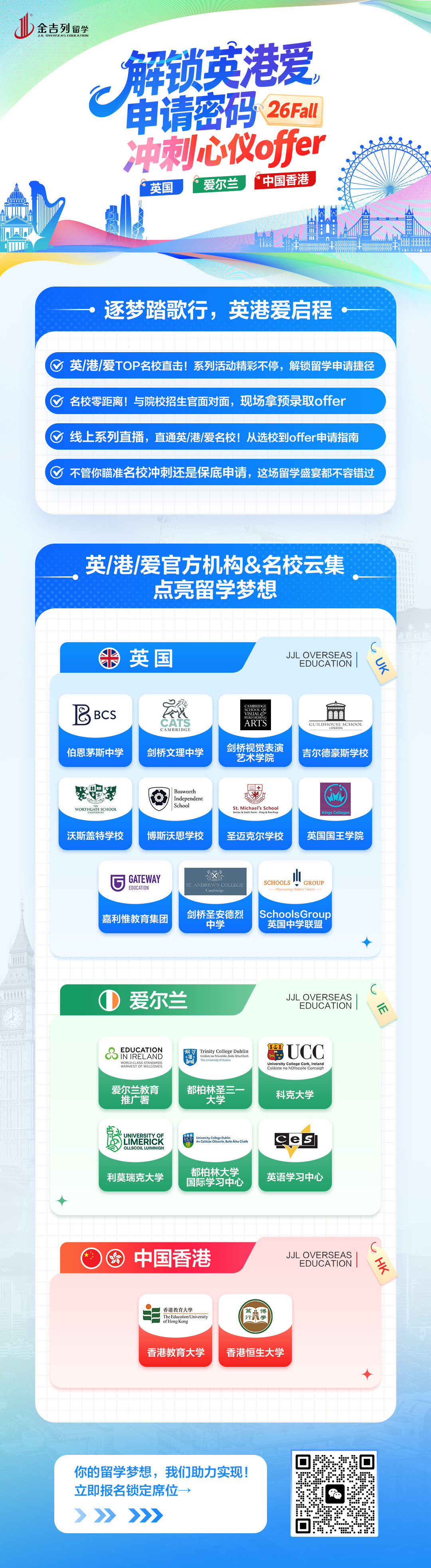 看完这些同学们是不想要进一步了解这些宝藏留学目的地都有哪些院校,别着急!金吉列特推出「解锁英港爱申请密码,冲刺26Fall心仪offer」活动,帮大家精准破解选校困惑、申请难点!