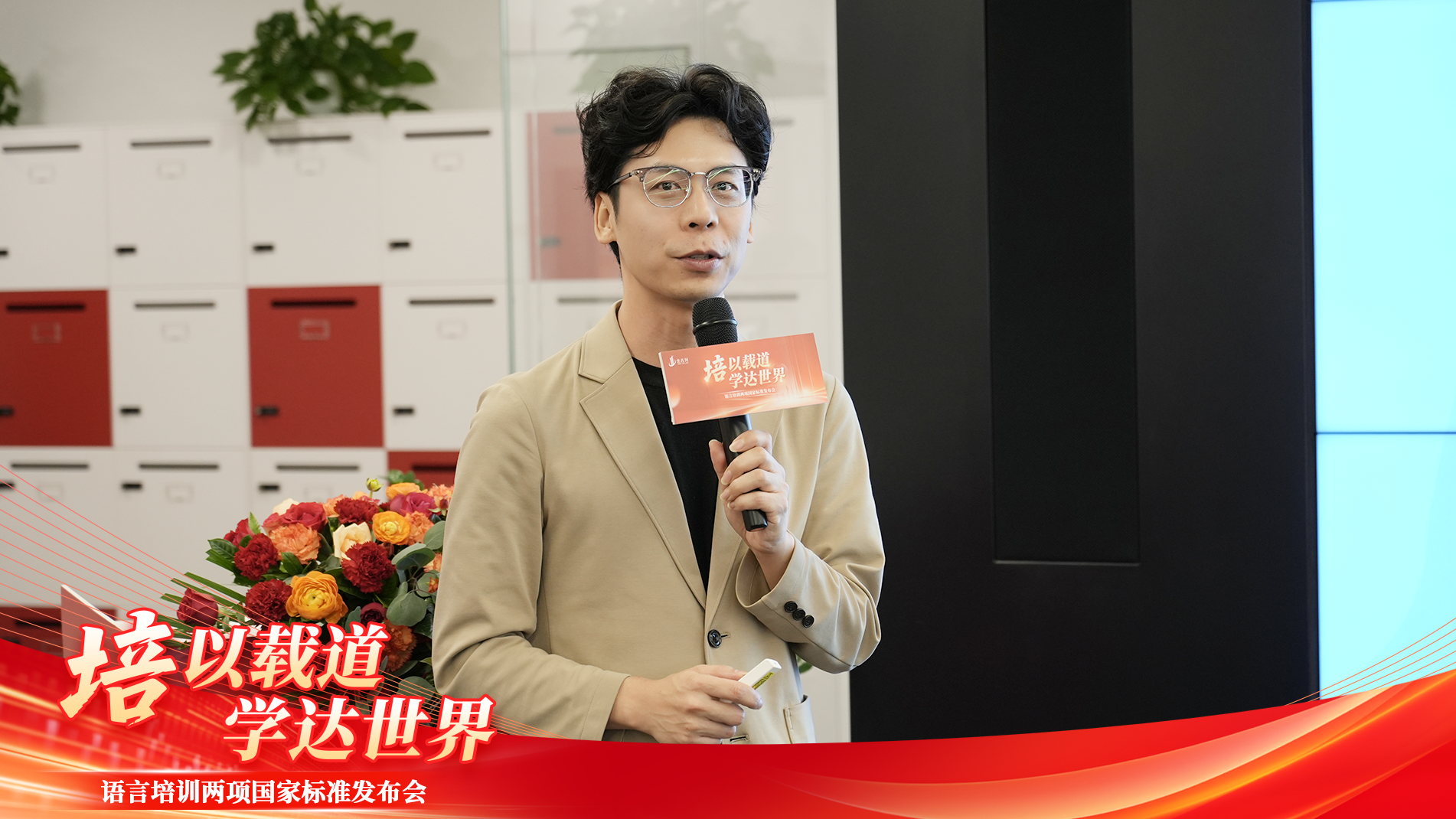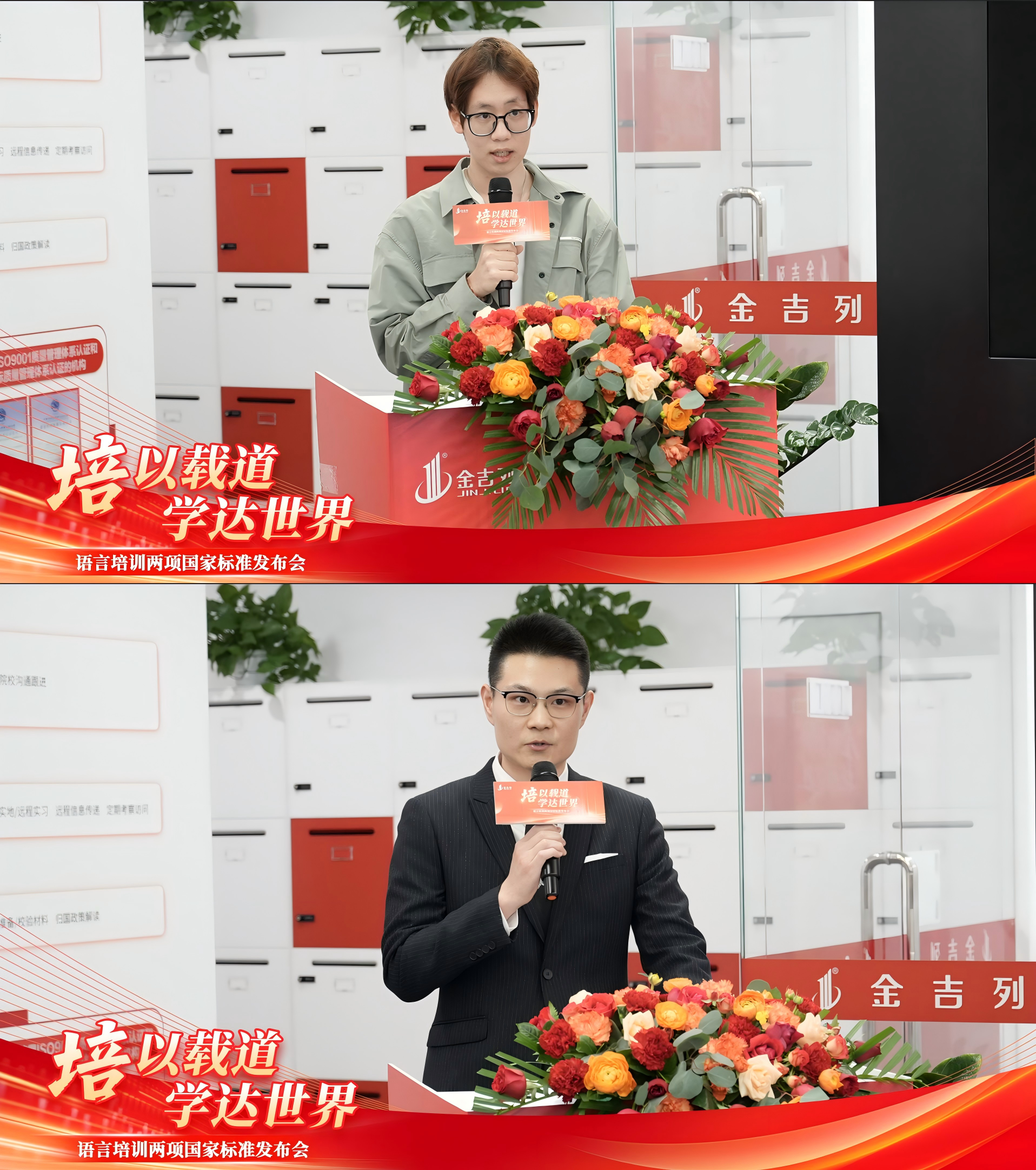 发布会现场气氛热烈,金吉列语培优秀教师代表与学生代表先后登台,从教育实践与学习体验双重视角,分享了两项国家标准对语言培训领域带来的深刻影响与实践心得。金吉列语培教学经理邓琰先生认为,两项标准的发布为教学评估提供了科学依据,教师提供了科学量化的教学诊断工具,使个性化教学方案的制定更具针对性,有效促进教学质量的精准提升。