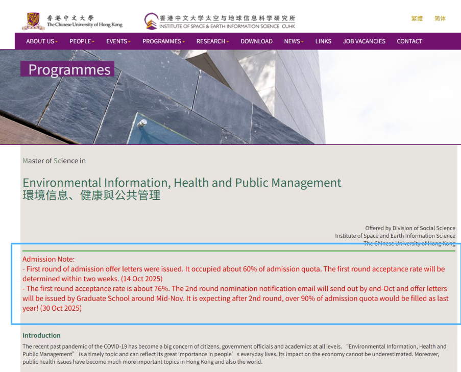 没想到港中文MSc Environmental information,Health and Public Management这个专业今年这么火爆,官网直接写首轮已经发了76%的录取了