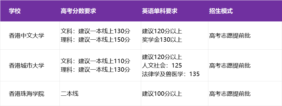 成绩要求【港中文/港城大】:高考总分超一本线110-150分,英语120-130分以上。港珠海学院:二本线+英语100分以上(部分省份招生)。