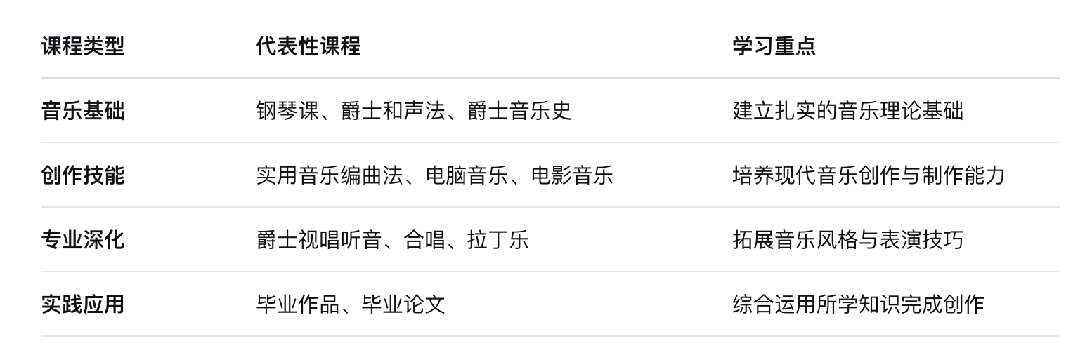 后现代音乐专业的课程设置体现了其融合创新的理念。根据多个来源的信息,课程主要包括以下几个方向: