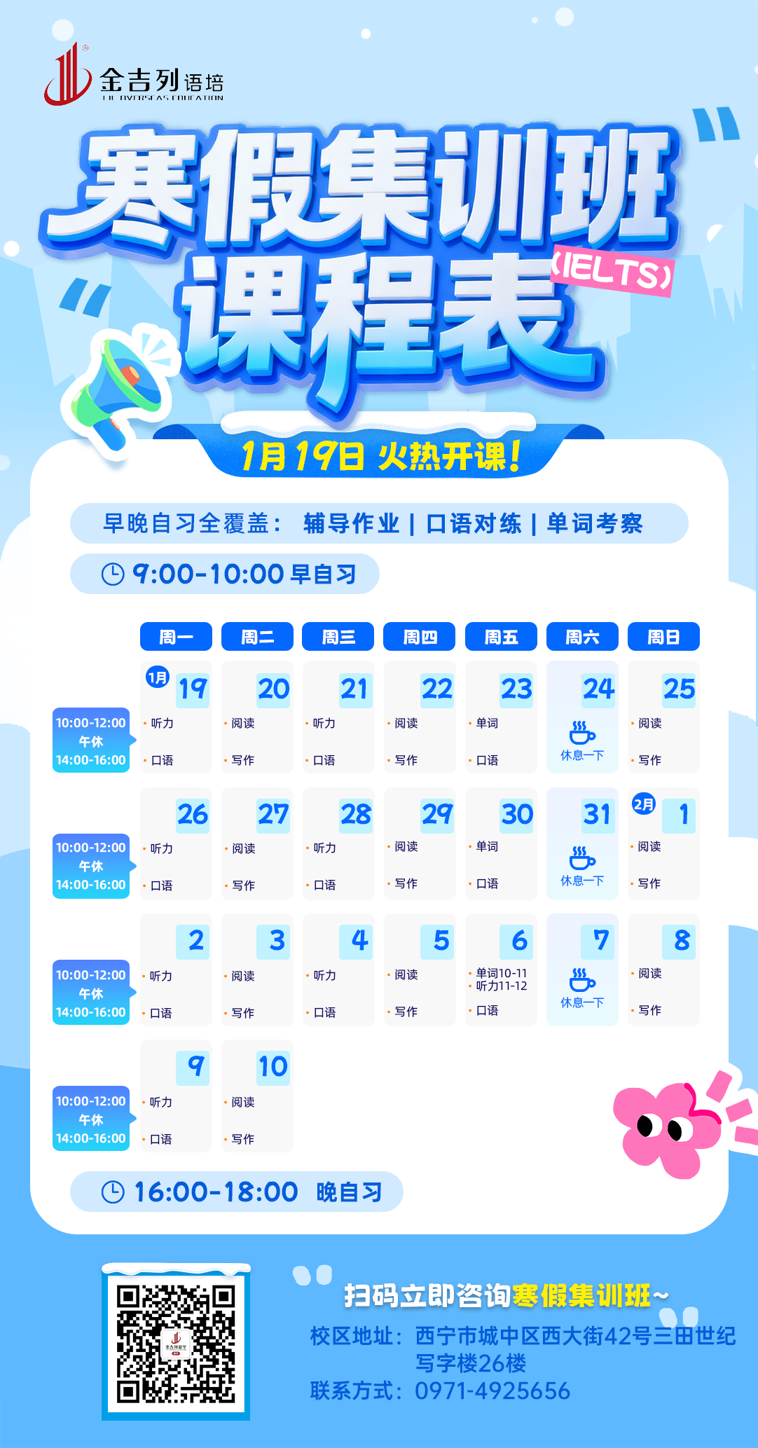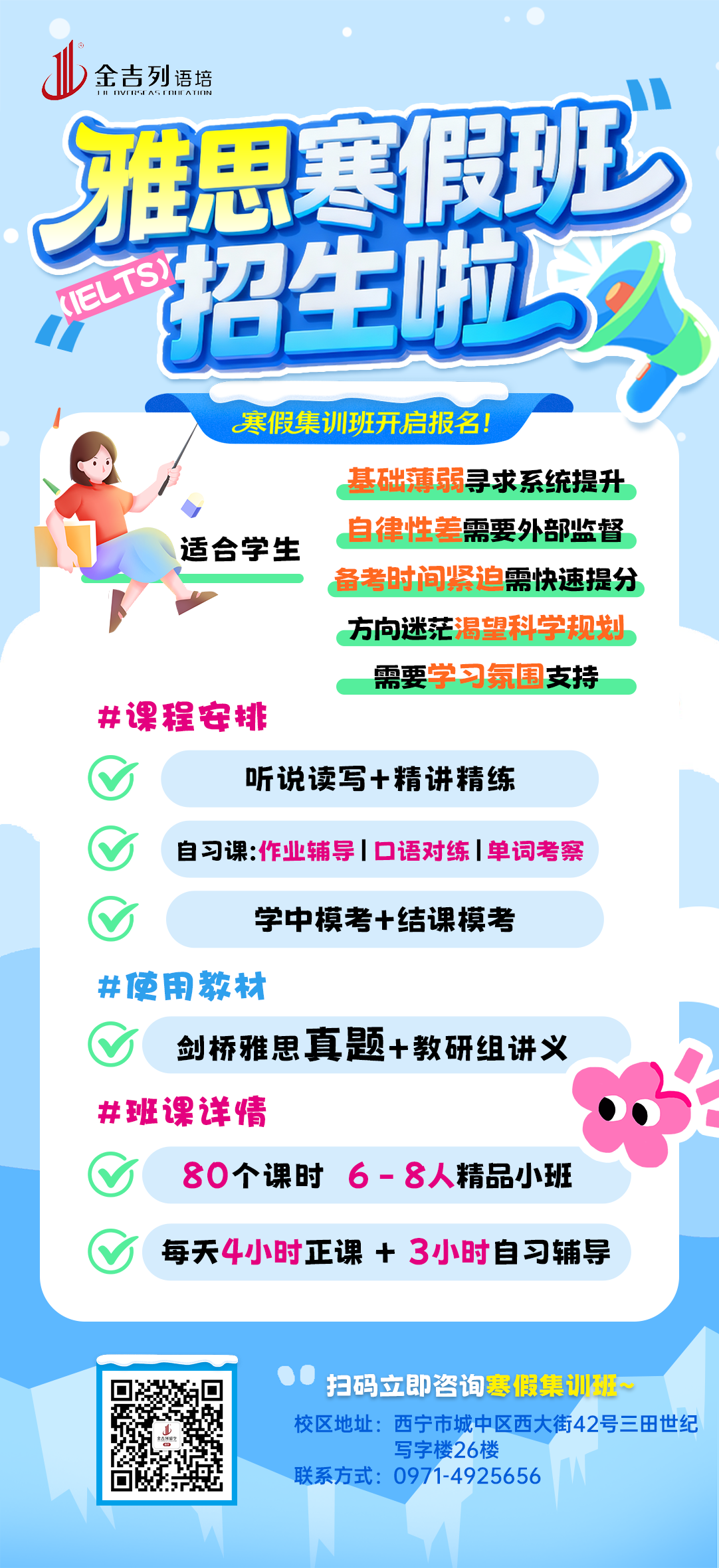 当西宁的寒风遇上留学备考的热情,金吉列留学西宁分公司雅思托福寒假班火热启幕!这个寒假,不做无效努力,只搞精准提分——从基础夯实到技巧突破,从模考冲刺到考前点睛,我们帮你把寒假时间转化为实打实的分数,离名校Offer再近一步!