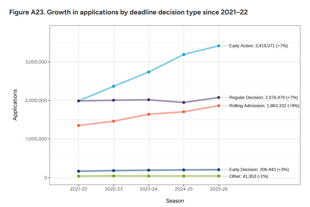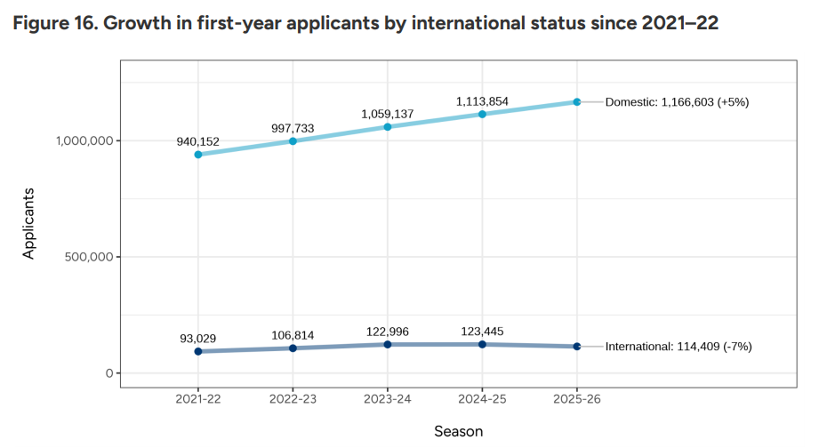 申请人数较 2024-2025 学年同期的 1,237,299 人增长4%。总申请量从 2024-2025 学年同期的 7,085,577 份增至 2025-2026 学年的 7,607,278 份,涨幅 7%,人均申请数增长 4%。