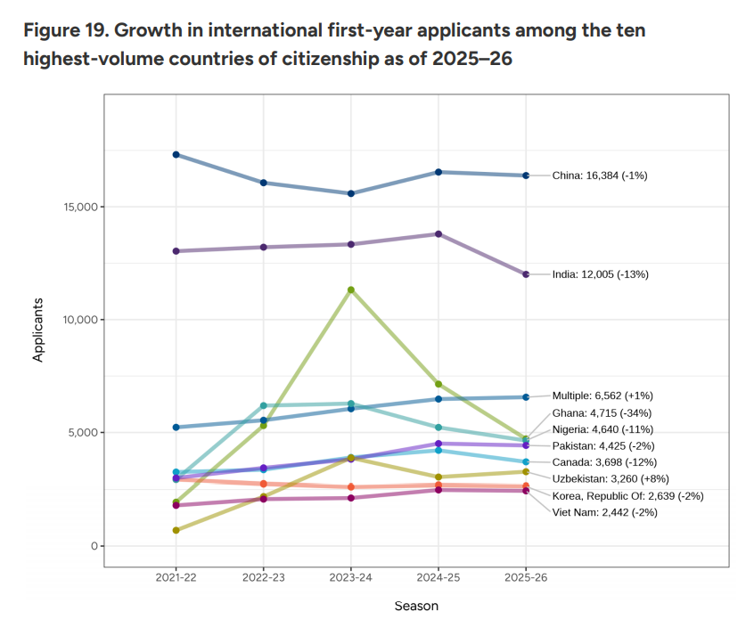 其中非洲地区的申请人数量下滑尤为显著,与 2024-2025 申请季同期相比,申请人数量下降14%。