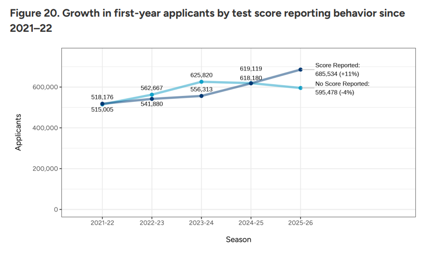 提交标化考试成绩的申请人数量持续增长,较 2024-2025 学年同期增幅达 11%;而未提交成绩的申请人数量则同比减少 4%。这一变化与美国众多大学恢复标化成绩要求直接相关。
