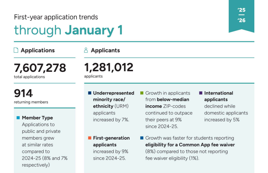 截至1月1日,2025-2026 学年美国本科生共有1,281,012 人在Common App上提交了新生入学申请,总申请量达到 7,607,278 份。