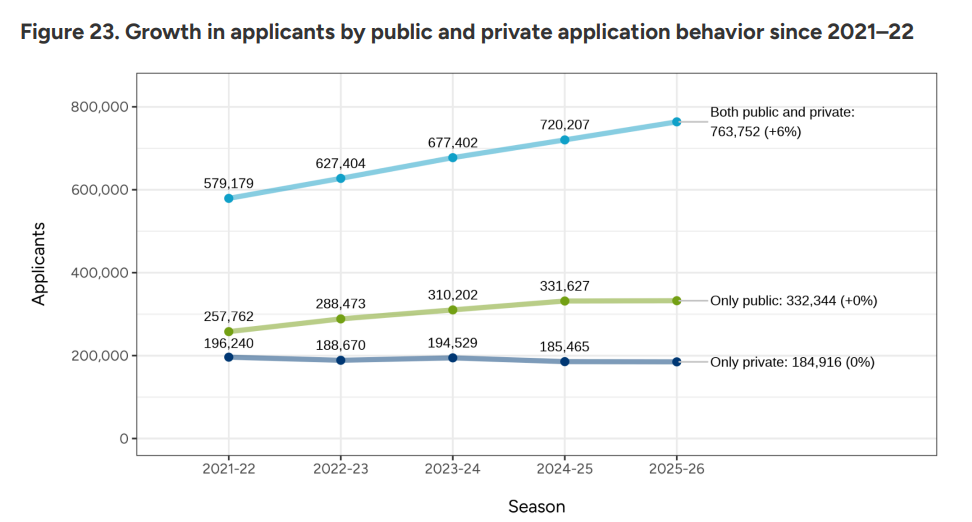 按照申请行为来看,2025-2026 学年,同时申请公立与私立院校达到763,752 人,较去年增长 6%;而仅申请公立院校(332,344 人)和仅申请私立院校(184,916 人)的群体规模未出现增长。