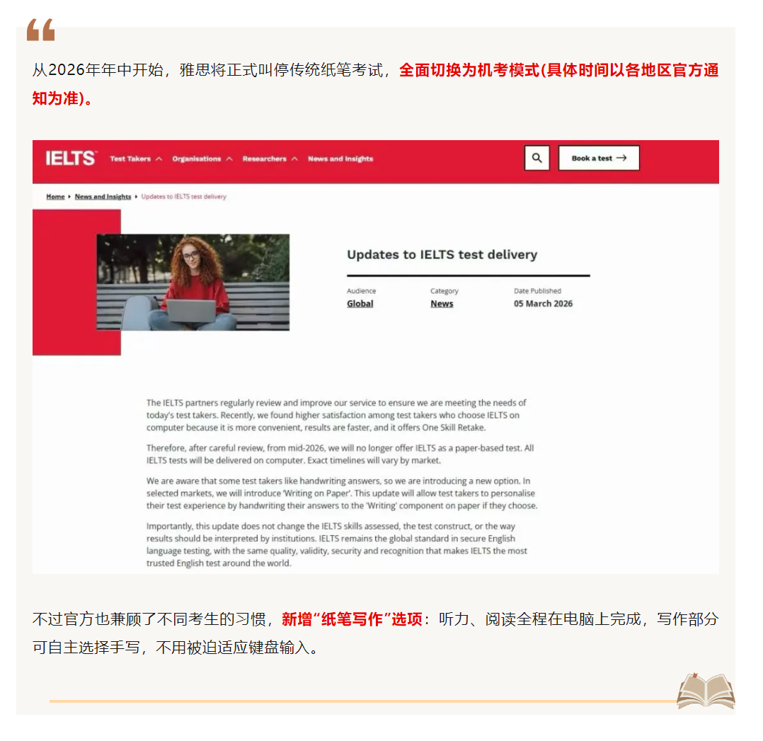 2026年起,雅思正式进入“全面机考时代”,但为了照顾习惯手写的同学,官方贴心地留了个“手写写作”的口子。