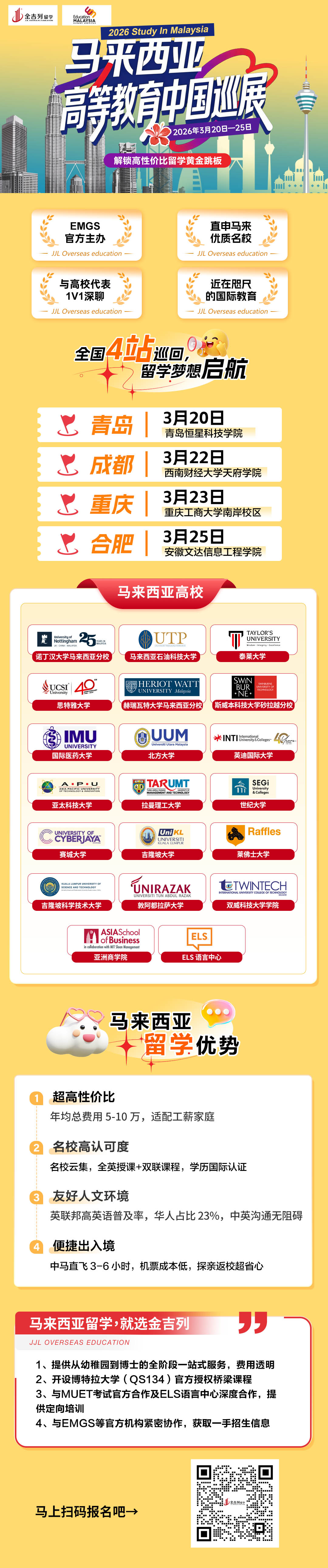 现在,有一场重磅官方福利送进校园——你无需在网上盲查信息,也不用跨城奔波咨询,马来西亚EMGS官方留学推介会即将走进国内四座城市,面对面为你解答留学疑问!