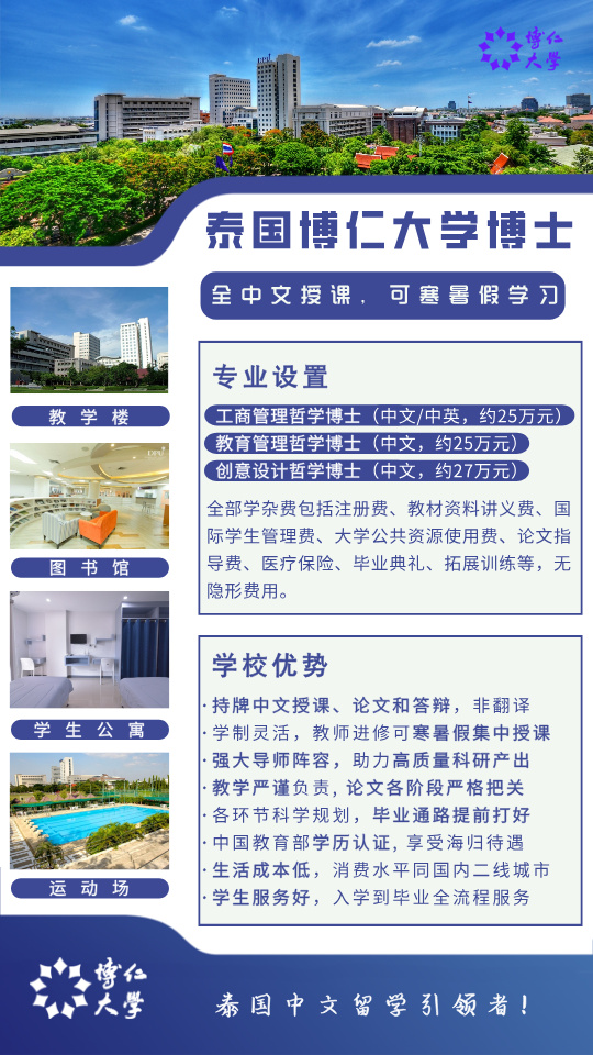 博仁大学成立于1968年,是一所以经贸教育为主、立足泰国、面向全球的综合性私立大学。商科领域长期位居泰国高校榜首,并在人文、社会科学、管理科学等领域具有显著优势。博仁大学为中国教育部涉外监管信息网公布的留学推荐院校,博仁大学颁发的学位获中泰两国教育主管部门认可,并可在中国教育部留学服务中心获得学历学位认证。