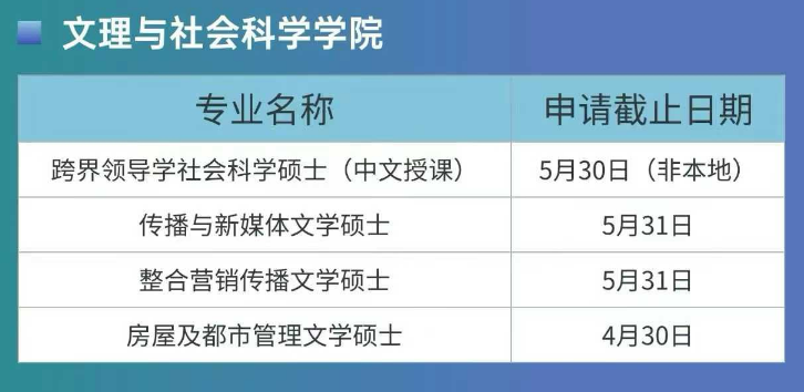 该学院专业覆盖广泛,其中中文授课项目为内地学子提供了更多选择,各专业截止日期: