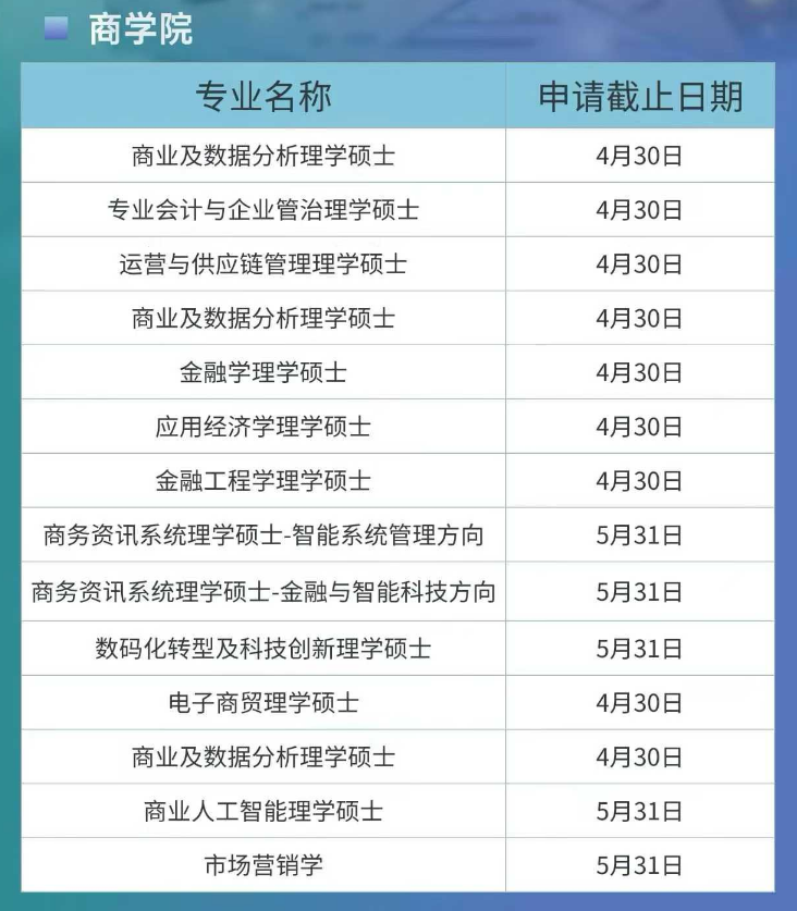 商学院作为香港城市大学热门学院,其商科类专业在全球范围内均具备较高认可度,以下为各专业申请截止日期: