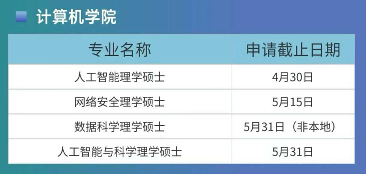 计算机学院紧跟数字化发展趋势,开设的人工智能、数据科学等专业,契合行业人才需求,具体截止日期如下: