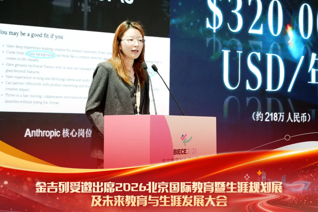 4月26日,金吉列留学副总裁齐亚静女士受邀出席“分论坛三:AI+未来教育——数字赋能下的生涯发展”,以“数智时代,让生涯选择更清晰、成长更精准”为主题,为广大家庭带来精彩分享。