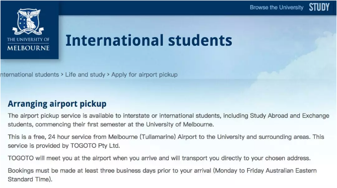 Google搜索“university of melbourne airport pickup”,在international stuent pickup的网页中可以找到相关信息,下面就由小编来为大家划重点:
