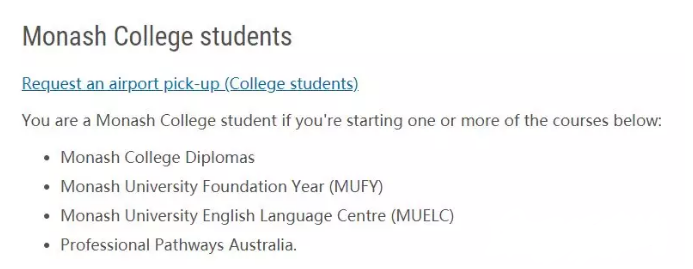 Google搜索“monash univeristy airport pickup”,对于college学生和university学生有不同的申请要求,不过都需要 提前至少三个工作日 提交申请。