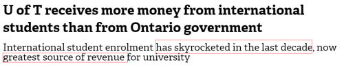 近日,加拿大多伦多大学在校刊上刊登了这样一篇文章,一时间在留学圈引起了讨论: “多伦多大学重度依赖留学生,所获经济收益远超政府拨款与本地学生”。