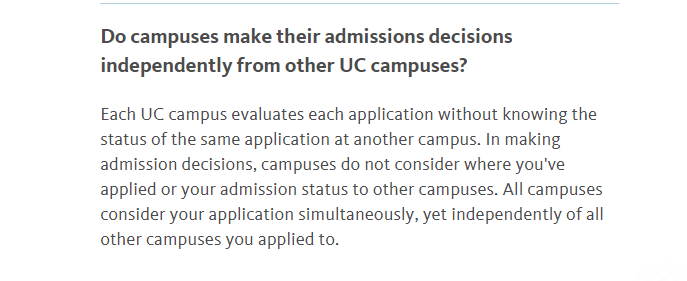 所有加州分校的录取决策都是独立做出的,任何一个分校并不知道你到底申请了几所分校,也不知道你到底录取了哪里。 ”