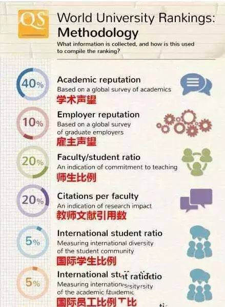QS世界大学综合排名运用六方面的具体指数衡量世界大学, 这六个指数和他们所占的权重分别是: