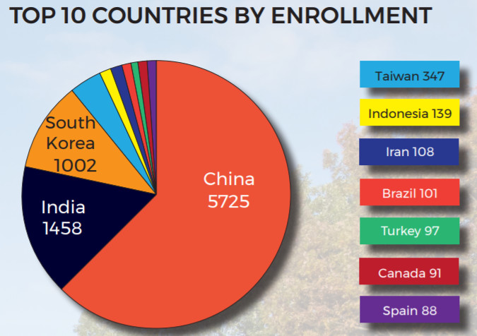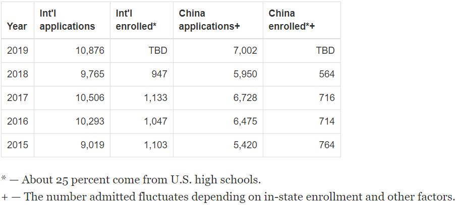 根据UIUC招生办提供的数据,申请在今年秋季入学的2019-20学年的中国学生数量超过7,000,超过去年的5,950和前年的6,728人。不仅如此,国际新生总体申请数量也同样创出新高,达到10,876。去年,国际学生申请数量也出现了下跌,在2016和2017连续两年超过万人以后,罕见降至9,765人。