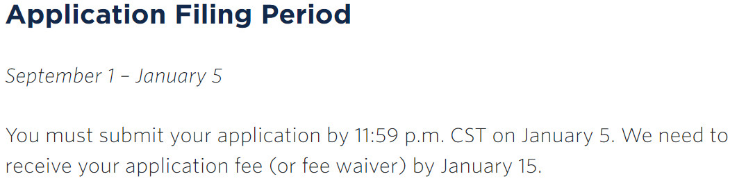 从官网发布的消息可以看到,申请开放时间是美国时间2019年9月1日,申请截止时间是美国时间2019年11月1日。申请人必须于美国中部时间(CST时区)11月1日当天夜里11点59分之前完整提交自己的申请表和申请费。该校官网提示说,在早申请阶段提交申请的学生,有最大的几率(相对于常规申请阶段)录取到自己心仪的专业。