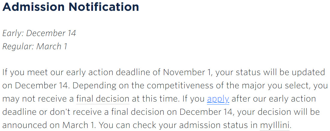 UIUC早申请和常规申请的招生通知日分别为: 2019年12月14日 和 2020年3月1日 。
