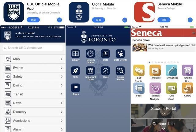 加拿大的越来越多的大学和学院都开发了各自院校的APP,方便学生在院校学习过程中能更便捷的使用,不但能对学生的学习和交流提供平台。同时,学生能通过院校APP来掌握院校的新闻、活动、和动态。例如:不列颠哥伦比亚大学University of British Columbia、多伦多大学University of Toronto、Seneca College等院校。