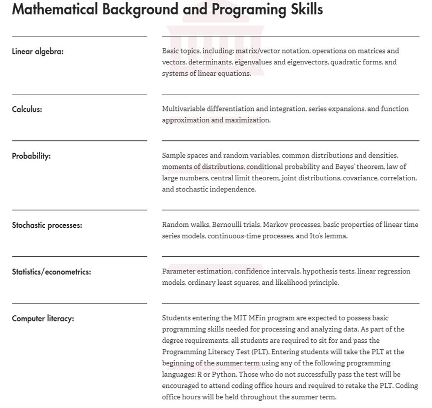 美国金融硕士项目对本科专业背景一般没有要求,但有些学校会有先修课要求,比如MIT金融硕士项目建议有数学和编程背景: