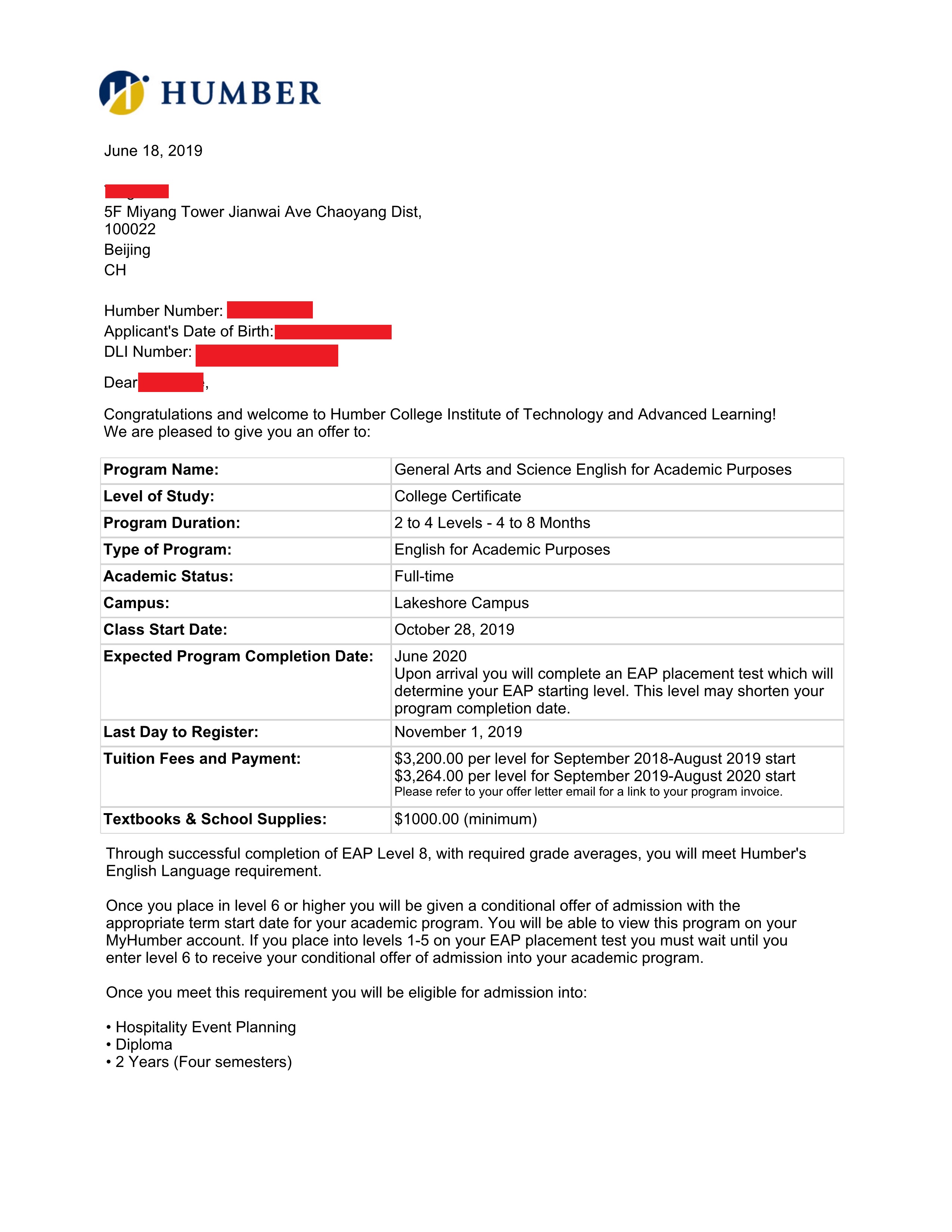 学生父亲朋友的孩子在汉博学院就读,反馈很好,建议学生可以去读这所学校,另外学生家长对加拿大的教育体制,工签政策和移民政策非常认可,所以留学的事情确定之后,很快办理,办理之后,非常配合我们准备相关申请材料,学校很快给予录取。
